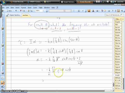 Simple Harmonic Motion (SHM) is a periodic motion of some object caused by a restoring force that is proportional to the displacement, such as a spring. Here is a different type of setup where a stick is lying on a frictionless table, with one end nailed to the table (which serves as the axis of rotation) and a spring attached near the other end of the stick. If the stick is stretched slightly, so the stick forms a small angle relative to the vertical axis it had prior to stretching the spring, we can use the small angle approximation. This says that for a small angle, the angle in radians is approximately equal to the sine of the angle. Also, cosine of that small angle approaches 1. We need both these approximations to solve this one! Check it out.